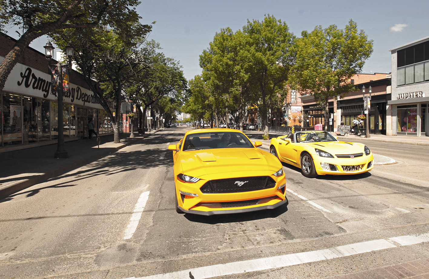 Alors nous aussi, nous avons voulu voir Edmonton. Nous avons à peine posé le pied sur le sol canadien. Où peut-on grignoter s’enquiert-on ? L’aubergiste nous vend Whyte Avenue comme l’artère ‘‘hype’’ de la ville. On a de la chance, c’est à deux pâtés de maison. Premier pâté de maison. Nous passons devant une immense concession Chevrolet – Chevy pour les intimes. Les Corvette sont en vitrine. Second pâté de maison, ça y est nous y sommes, on ne peut pas se tromper. Oh, My Gosh ! Ca pétarade de tous côtés. Comme nous sommes encore un peu désaxées nous mettons un peu de temps à comprendre : Nous sommes samedi soir et tout Edmonton parade sur Whyte. Corvette, mais pas que : Cadillac rutilantes, Mustangs GT, camions Ford des années 50 complètement tunés, pick ups General Motors passés dans la potion magique du druide… Dès que les feux passent au vert les moteurs vrombissent, c’est à qui sera le plus remarqué. Une Jeep passe, elle nous fait soudain l’effet d’un nain de jardin.