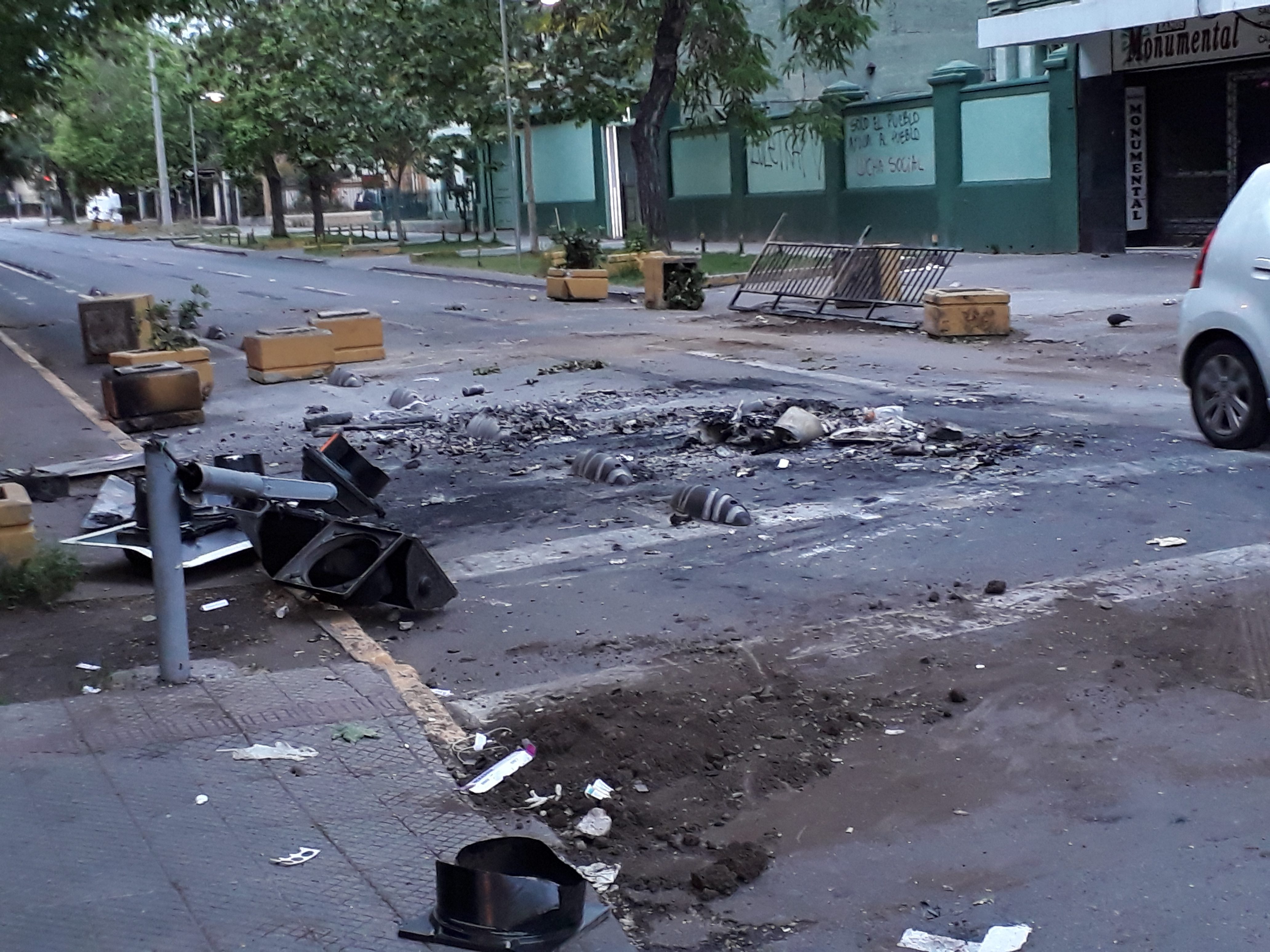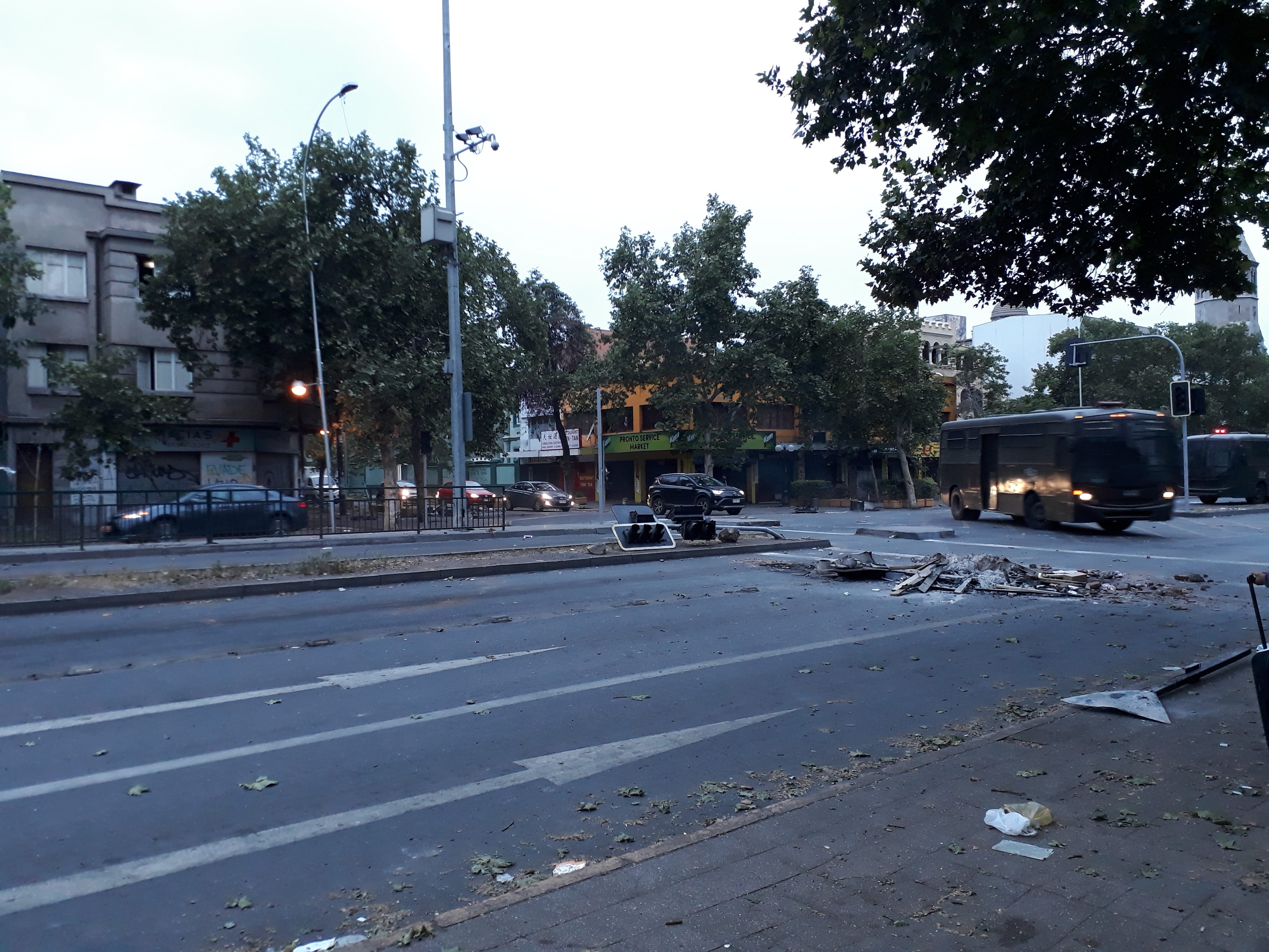 Désolation et barricades fumantes ce dimanche matin dans Santiago. Nous quittons la ville et ses habitants abasourdis. Les rues sont encore désertes, les taxis zigzaguent entre les décombres. Des silhouettes, les mains noires de suie, se faufilent, remplissant leurs sacs d’objets ramassés dans la rue. Un bureau a été saccagé. Des centaines de papiers jonchent le sol.